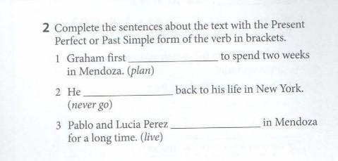 2 Complete the sentences about the text with the Present Perfect or Past Simple form of the verb in brackets. 1 Graham first to spend two weeks in Mendoza. (plan) 2 He (never go) 3 Pablo and Lucia Perez, for a long time. (live) back to his life in New York. in Mendoz