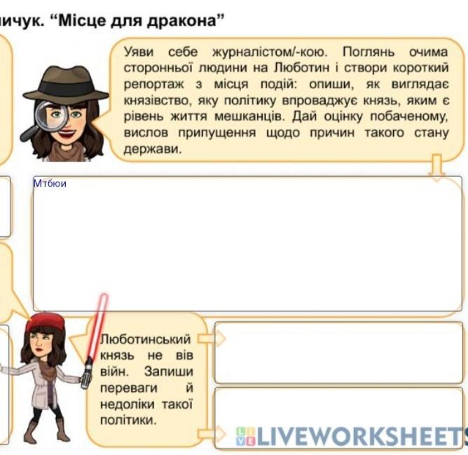 1)Уяви себе журналістом/-кою. Поглянь очима сторонньої людини на Люботин і створи короткий репортаж з місця подій: опиши, як вигляда князівство, яку політику впроваджує князь, яким є рівень життя мешканців. Дай оцінку побаченому вислов припущення щодо причин такого стану держави.