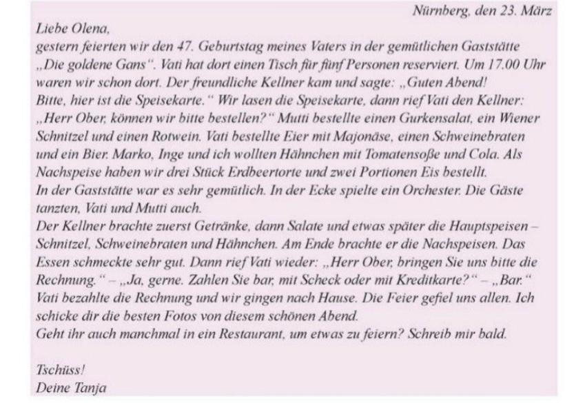 Lies den (S.109) Brief und beantworte die Fragen. Wähle die richtige Antwort und kreuz an. 1. Was hat Tanjas Familie gestern gefeiert? den Muttertag den Nikolaustag den Geburtstag in der Eisdiele 2. Wo hat Tanjas Vater einen Tisch reserviert? in der Gaststätte im Wirtshaus 3. Was hat der Kellner den Gästen gebracht? die Fahrkarte die Speisekarte 4. Welches Getränk hat Tanjas Mutter bestellt? ein Bier einen Saft 5. Welche Hauptspeise hat Tanjas Vater bestellt? ein Hähnchen einen Schweinebraten 6. Wie hat das Essen geschmeckt? schlecht nicht besonders die Kinokarte einen Rotwein ein Schnitzel sehr gut 7. Was hat der Kellner den Gästen nach dem Essen gebracht? die Zeitung die Rechnung die Zeichnung 8. Wie hat Tanjas Vater in der Gaststätte bezahlt? mit Kreditkarte bar mit Scheck