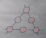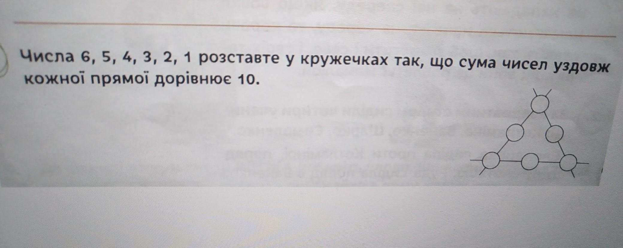 Числа 6, 5, 4, 3, 2, 1 розставте у кружечках так, що сума чисел уздовж кожної прямої дорівнює 10.
