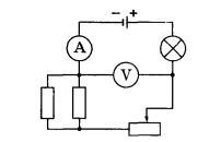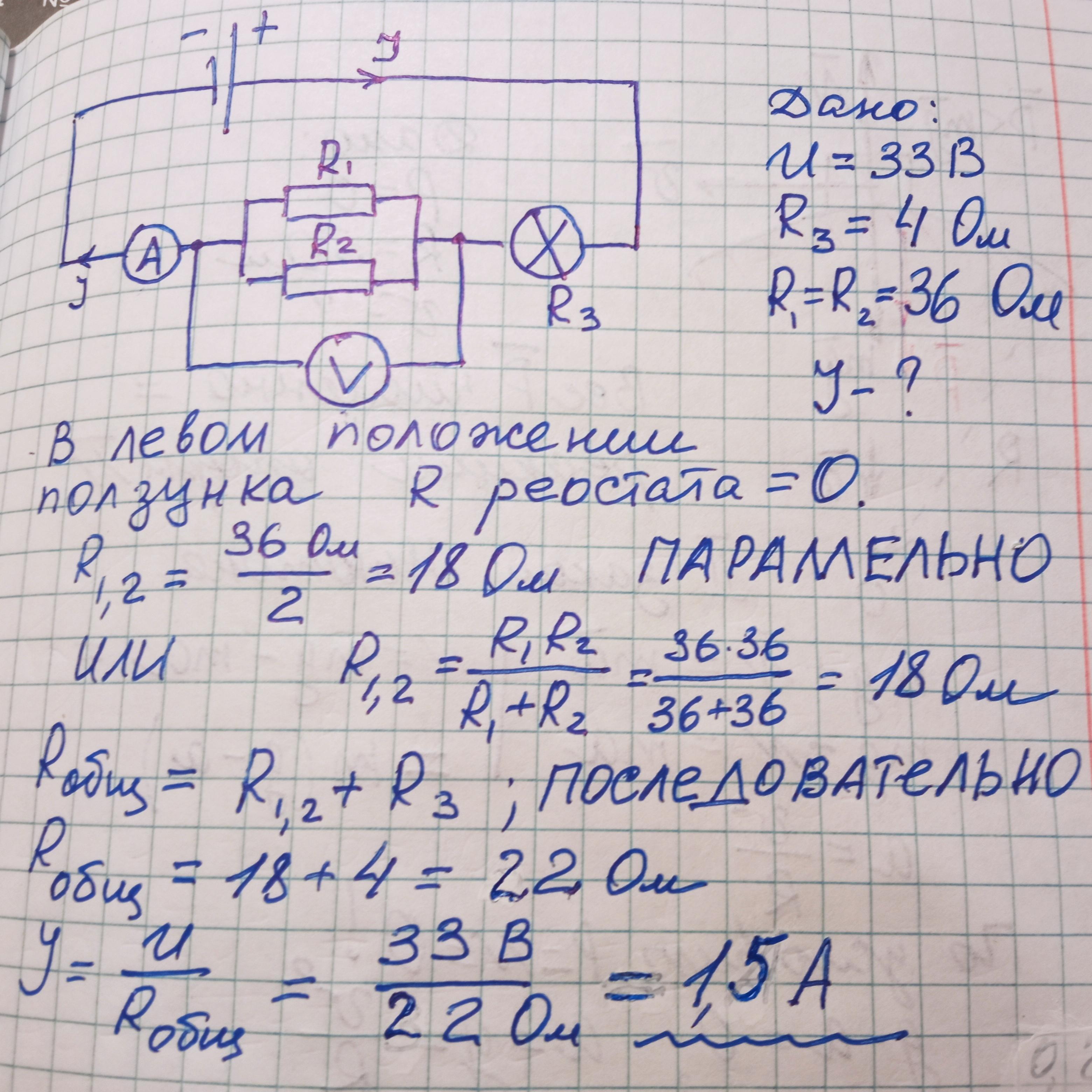 визначте показання амперметра в колі (див. рисунок), якщо напруга джерела струму дорівнює 33 В, опір лампочки - 4 ом, максимальний опір реостата - 20 ом, а опір кожного з двох однакових резисторів дорівнює 36 ом. Ковзний контакт займає крайнє ліве положення