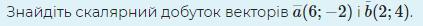 1 Знайдіть скалярний добуток векторів a(6; -2) і b(2; 4)