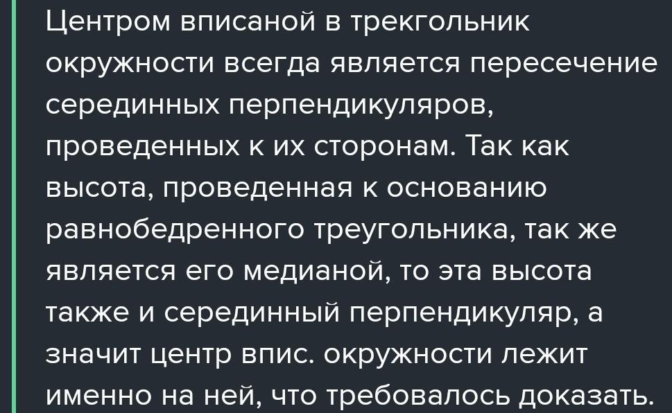 22.7. Докажите, что центр окружности, вписанной в равнобед- ренный треугольник, принадлежит высоте, опущенной из вершины, противолежащей основанию этого треугольника. ДАЮ 20 БАЛЛОВ!!!!!
