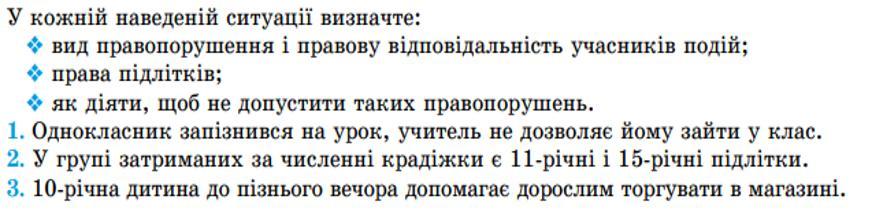 3)Вид правопорушення: порушення прав дитини на відпочинок та повну реабілітацію. Правова відповідальність учасників подій: дорослі, які допустять таку ситуацію, можуть бути притягнуті до адміністративної відповідальності.