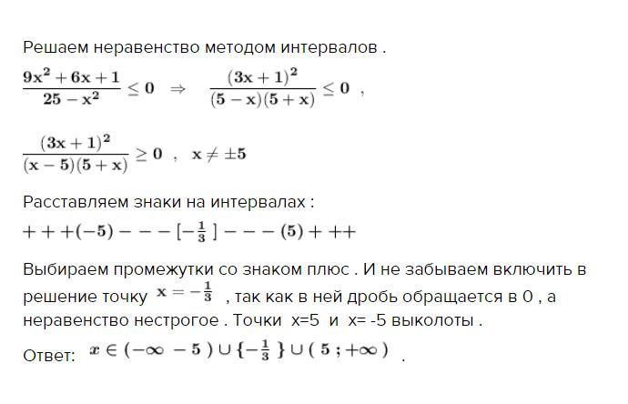 Выбираем промежутки со знаком плюс . И не забываем включить в решение точку , так как в ней дробь обращается в 0 , а неравенство нестрогое . Точки х=5 и х= -5 выколоты .