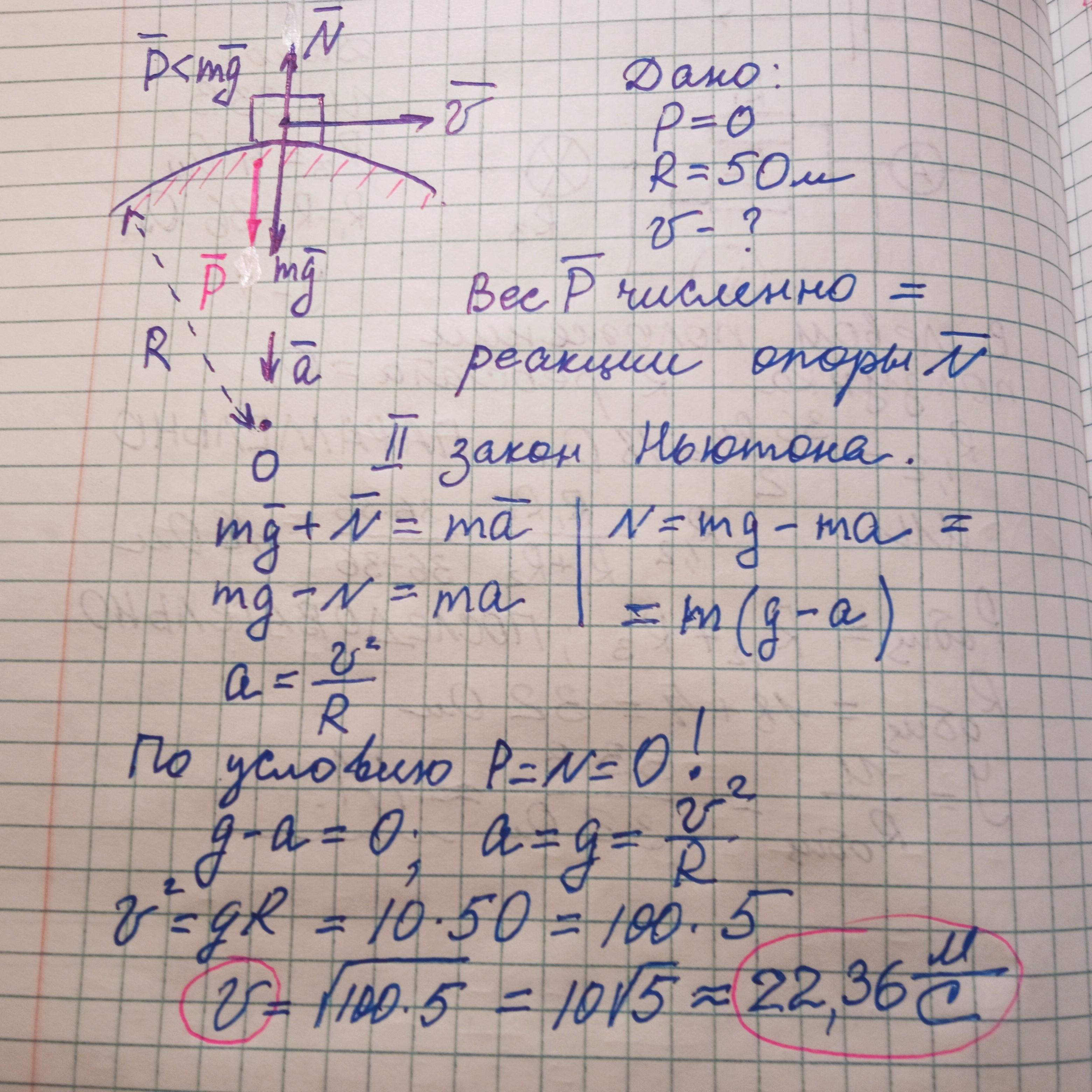 При движении по выпуклому мосту вес тела < силы тяжести. Р<mg. У нас Р=0.