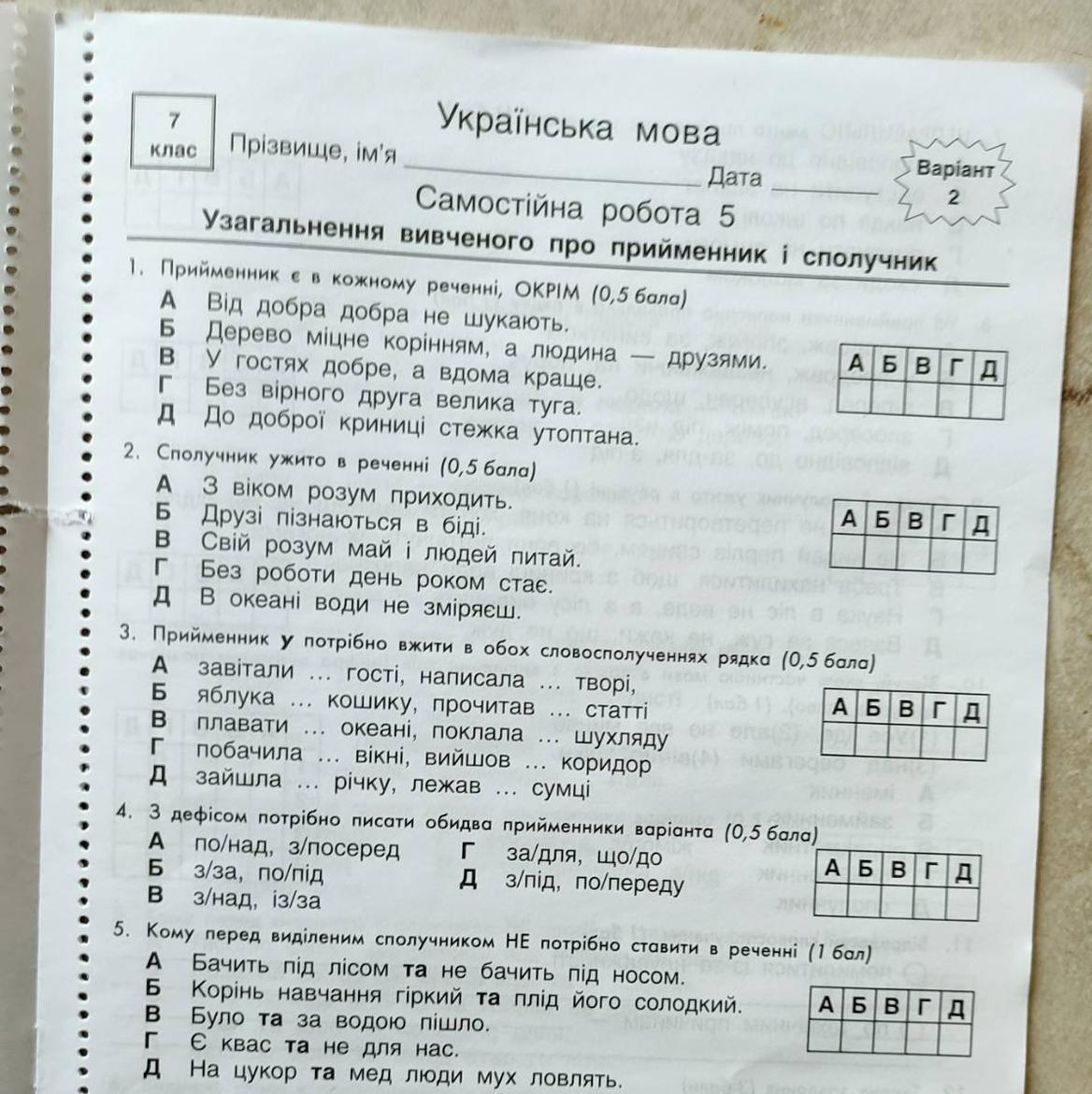 Объяснение: 6-го завдання немає на фото. Тому важко визначити, які слова виділені. У тих реченнях, що є в друкованому варіанті, виділено прийменники. Може, це допоможе.
