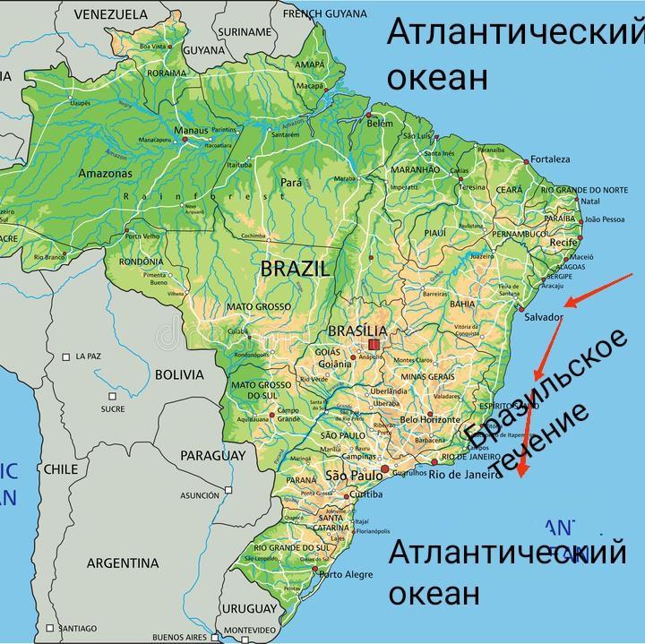 - берега Бразилии омывает Бразильское течение, отход от Южного Пассатного течения.