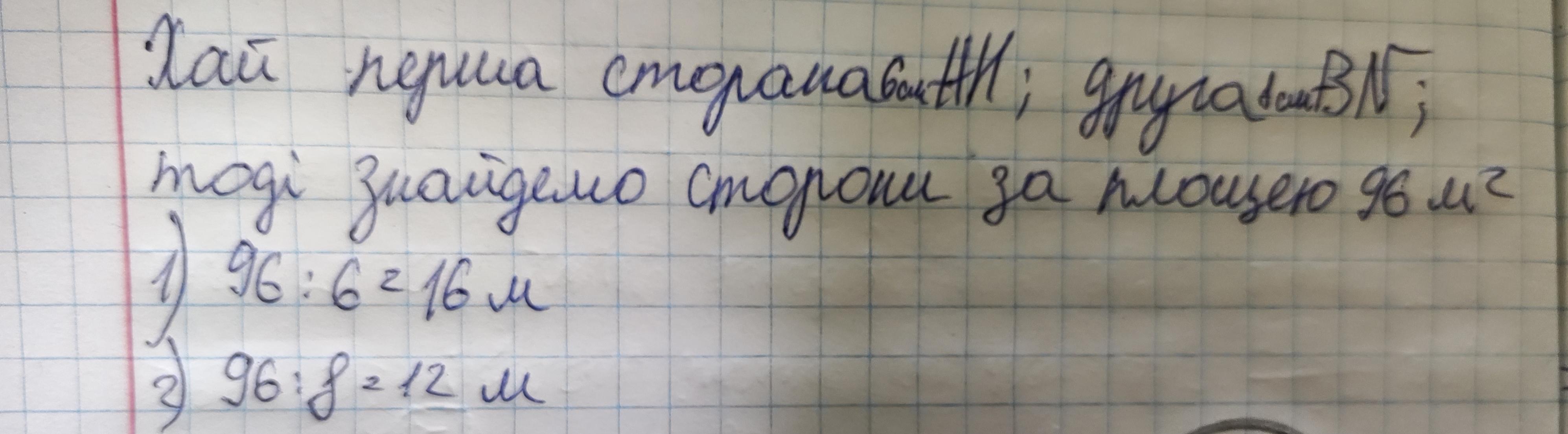 Площа листа фанери у вигляді паралелограма дорівнює 96 м2, а його висоти 6 м і 8 м. Знайти сторони паралелограма