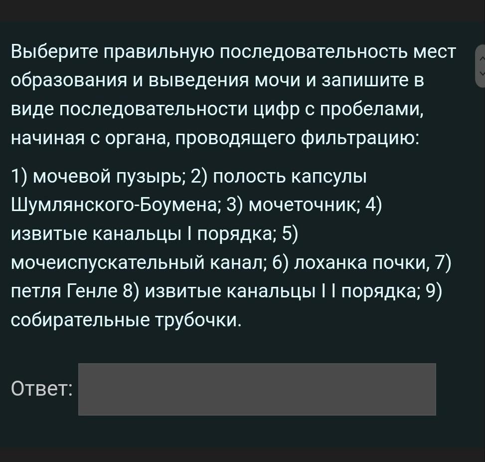 6) лоханка почки, 7) петля Генле, 8) извитые канальцы II порядка, 4) извитые канальцы I порядка, 2) полость капсулы Шумлянского-Боумена, 9) собирательные трубочки, 3) мочеточник, 1) мочевой пузырь, 5) мочеиспускательный канал.