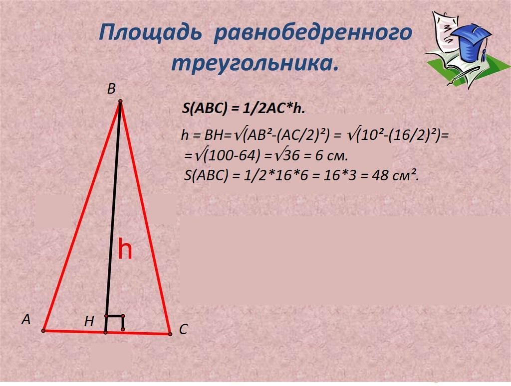 h = BH=√(AB²-(AC/2)²) = √(10²-(16/2)²) = =√(100-64) =√36 = 6 см.