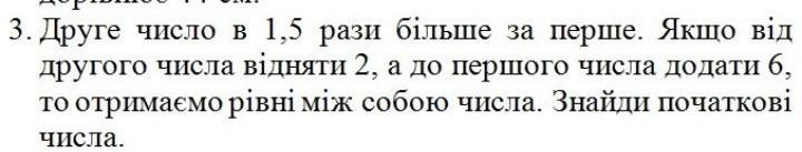 За умовою задачі, якщо від другого числа (1,5x) відняти 2, а до першого числа (x) додати 6, то отримаємо рівні між собою числа. Це означає, що ми маємо розв'язати таке рівняння: