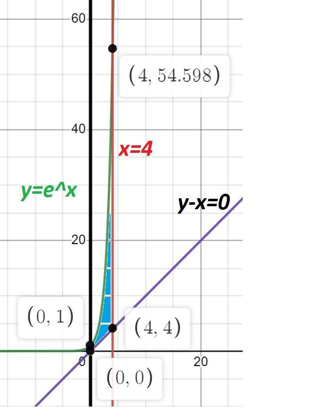 Вычислить площадь фигуры, ограниченной линиями y=(e^x), y-x=0, x=0, x=4, оформить с рисунком и объяснением всего, желательно сделать на листке и прислать файлом