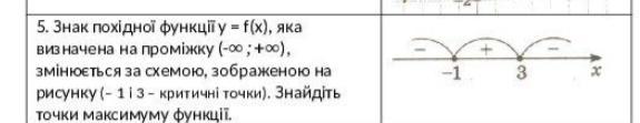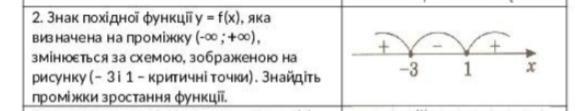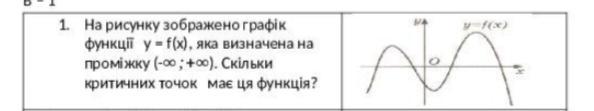 Якщо на проміжку (-; +) функція має критичні точки, то це можуть бути точки, де функція змінює свій знак або точки, де вона не є визначеною (наприклад, ділення на нуль). Проте з графіка видно, що функція у = f(x) не має жодної критичної точки на проміжку (-; +), тому відповідь: 0.