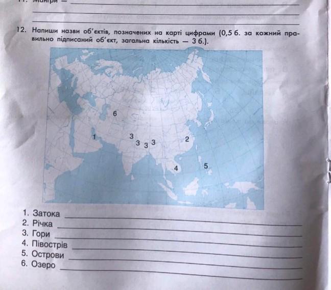 12. Напиши назви об'ектiв, позначених на карті цифрами (0,5 б. за кожний про- вильно підписаний об'єкт, загальна кількість 3 6.)