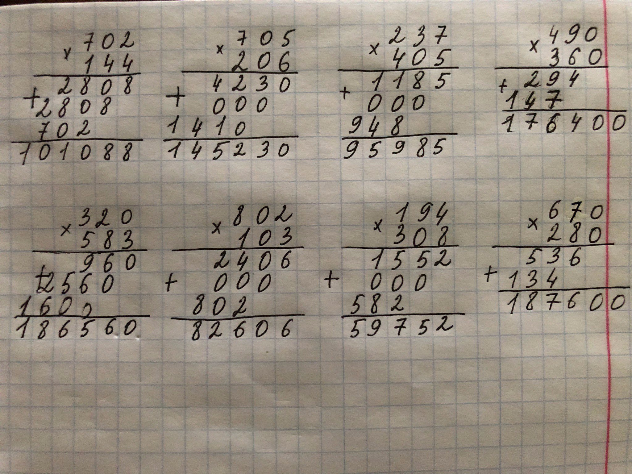 Примеры решать в столбик! №7 702*144= 705*206=Примеры решать в столбик! №7 702*144= 705*206= 237*405= 490*360= 320*583= 802*103= 194*308= 670*280 =