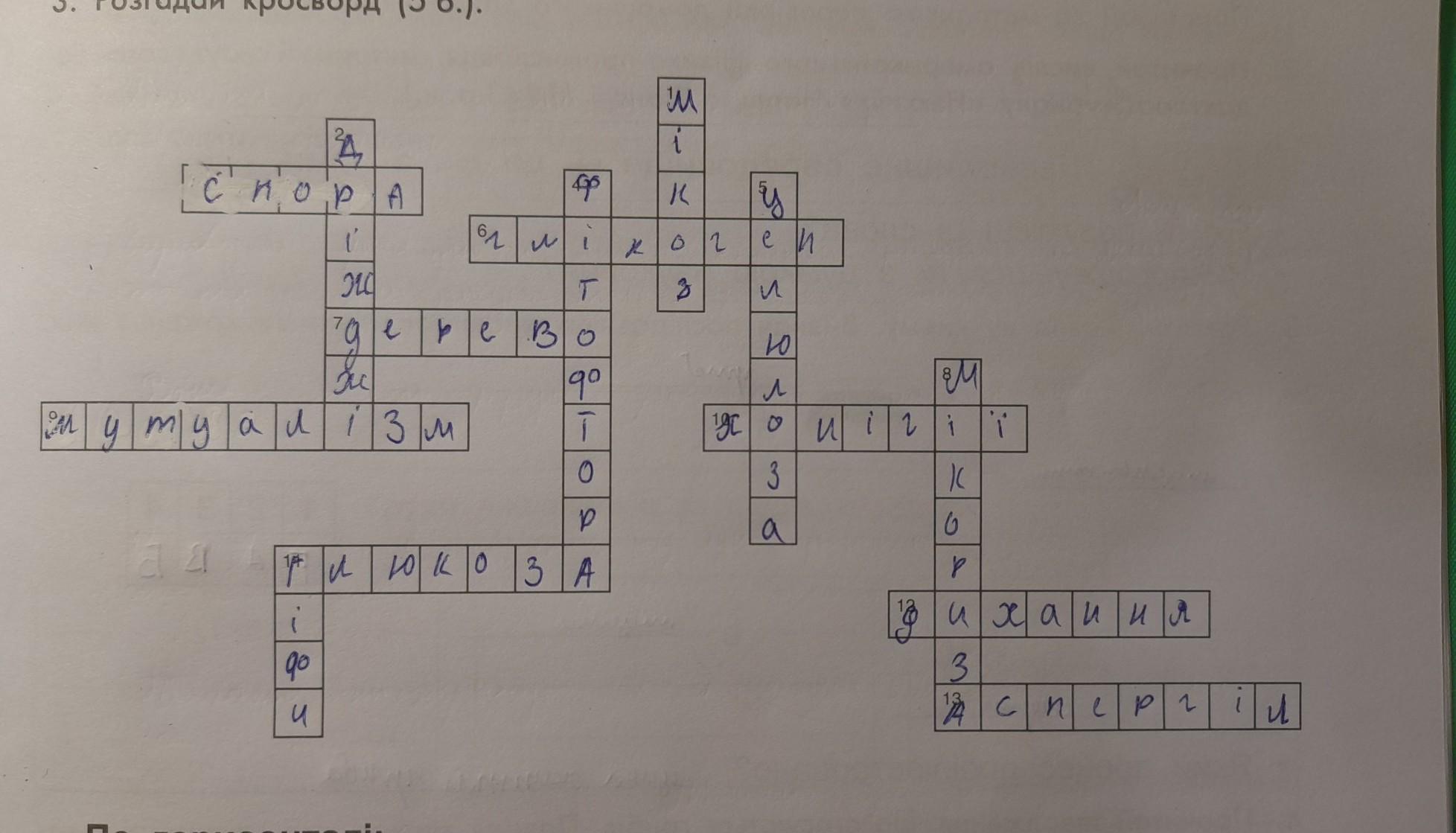 По горизонталі: 3. Спеціалізована клітина, що слугує для нестатевого розмноження грибів. 6. Запасна речовина грибів. 7. Одна з життєвих форм, що бере участь в утворенні грибокореня. 9. Взаємовигідне співіснування організмів різних видів. 10. Група ідентичних за будовою організмів (рослин, грибів, бактерій), які ростуть в одному місці та розмножуються вегетативно. 11. Речовина, що утворюється внаслідок фотосинтезу. 12. Одна з властивостей живого. 13. Представник цвілевих грибів. По вертикалі: 1. Захворювання, спричинене паразитичними грибами. 2. Гриби, які використовують у хлібопеченні. 4. Грибоподібний організм, що уражає картоплю й помідори. 5. Основний компонент клітинної стінки рослин. 8. Інша назва грибокореня. 11. «Матеріал», з якого побудована грибниця.