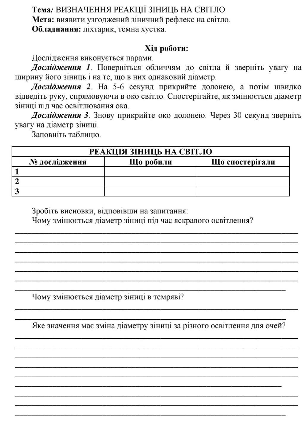 Що робили: На 5-6 секунд прикрили долонею, відвели руку, спрямовуючи в око світло. Спостерігали, як змінюється діаметр зіниці під час освітлювання ока.