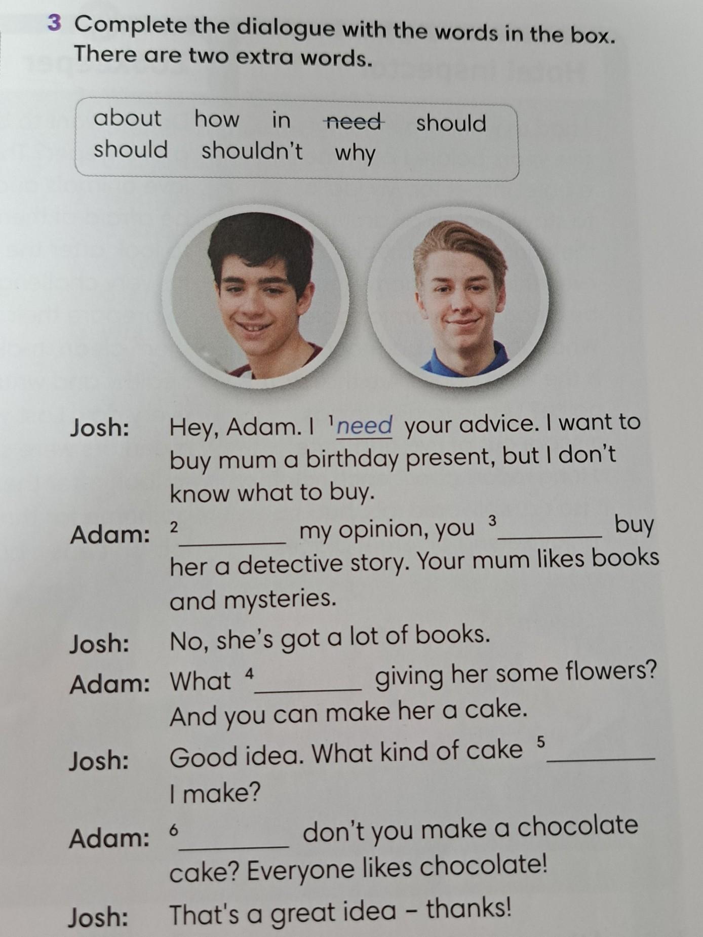 3 Complete the dialogue with the words in the box. There are two extra words. about how in need should should shouldn't why Josh: Hey, Adam. I need your advice. I want to buy mum a birthday present, but I don't know what to buy. Adam: 2 Josh: my opinion, you buy her a detective story. Your mum likes books and mysteries. Josh: Adam: What 4 Adam: Josh: No, she's got a lot of books. giving her some flowers? And you can make her a cake. Good idea. What kind of cake 5 I make? 6 don't you make a chocolate cake? Everyone likes chocolate! That's a great idea - thanks!