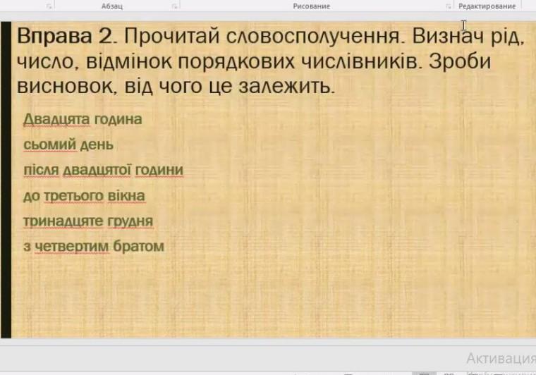 Двадцята година - жіночий рід, однинний відмінок.Сьомий день - чоловічий рід, однинний відмінок.Після двадцятої години - жіночий рід, однинний відмінок.До третього вікна - середній рід, однинний відмінок.Тринадцяте грудня - чоловічий рід, однинний відмінок.3 четвертим братом - чоловічий рід, однинний відмінок.