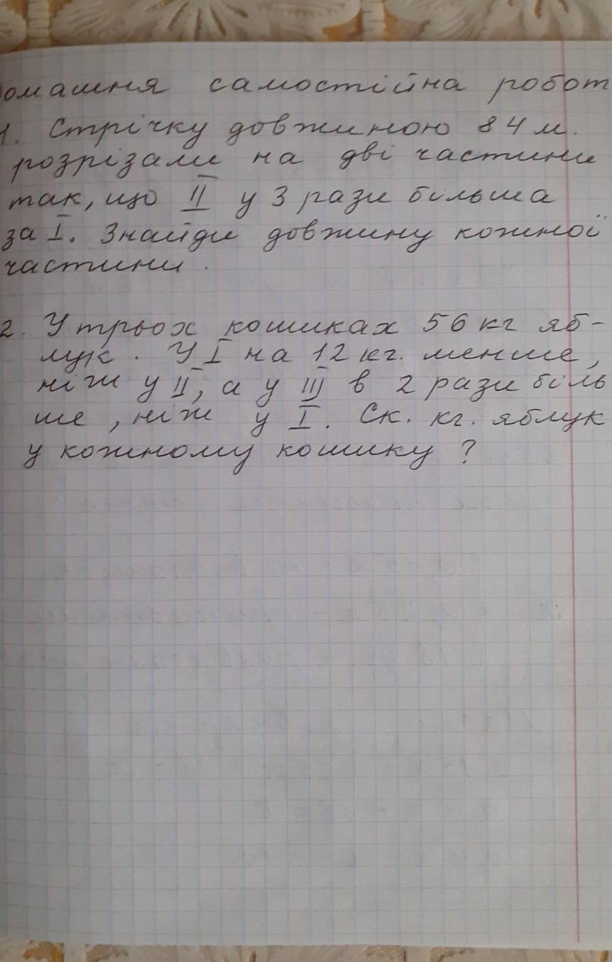 1) Стрічку довжиною 84 м. розрізали на дві частини так, що друга у 3 рази більша за першу. Знайди довжину кожної частини.
