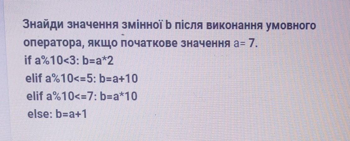 Знайди значення змiнноï ь пiсля виконання умовного оператора, якщо початкове значення а- 7