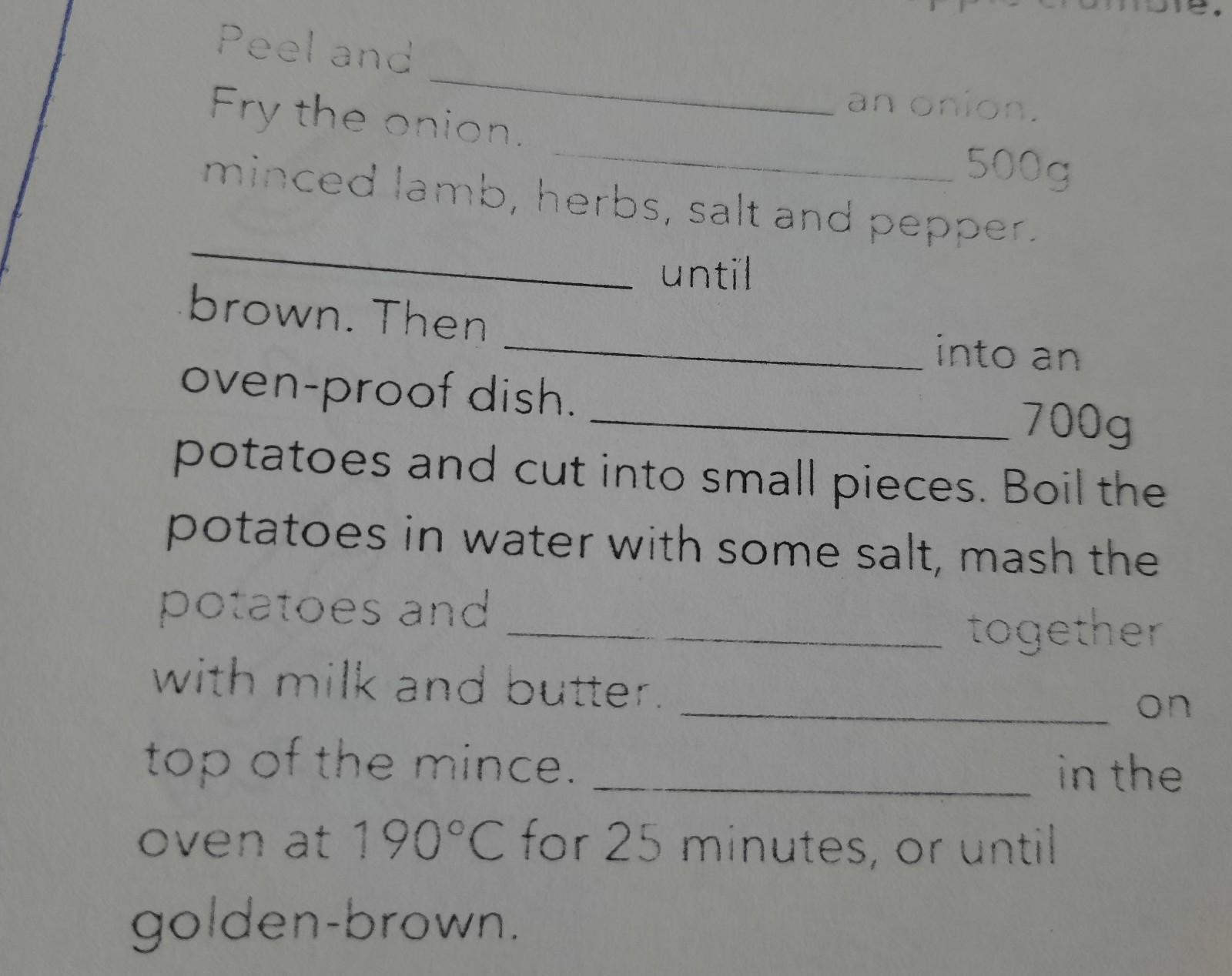 Peel and chop an onion. Fry the onion with 500g minced lamb,herbs, salt and pepper. Fry until brown. Than put into an ovenproof dish. Add 700 g potatoes….