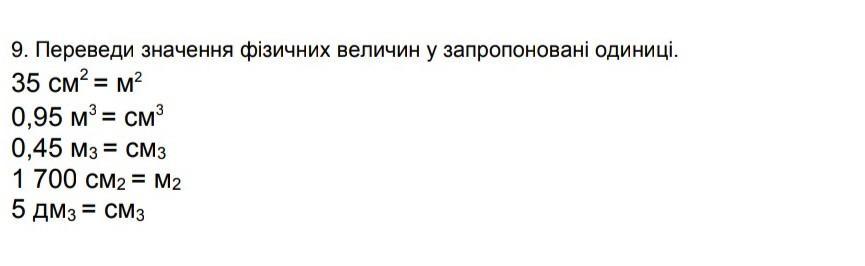 9. Переведи значення фізичних величин у запропоновані одиниці. 35 см2 = м2 0,95 м³ = см3 0,45 М3 = СМ3 1 700 СМ2 = M2 5 дм3 = СМ3