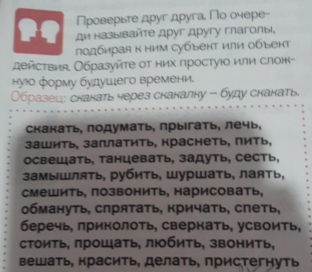 Проверьте друг друга. По очере- ди называйте друг другу глаголы, подбирая к ним субьект или объект действия. Образуйте от них простую или слож- ную форму будущего времени. Образец: скакать через скакалку - буду скакать. скакать, подумать, прыгать, лечь, зашить, заплатить, краснеть, пить, освещать, танцевать, задуть, сесть, замышлять, рубить, шуршать, лаять, смешить, позвонить, нарисовать, обмануть, спрятать, кричать, спеть, беречь, приколоть, сверкать, усвоить, стоить, прощать, любить, звонить, вешать, красить, делать, пристегнуть