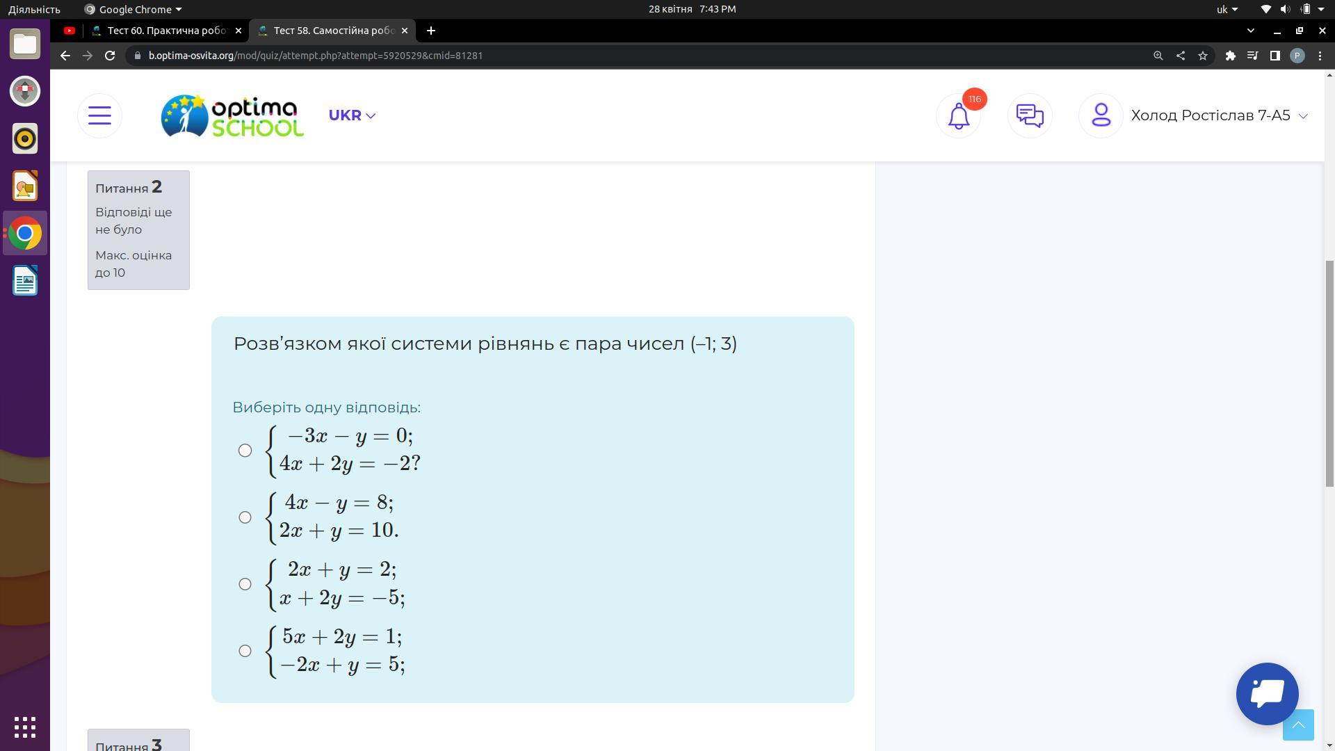 Решением четвертой системы уравнений является необходимая пара чисел (-1;3)