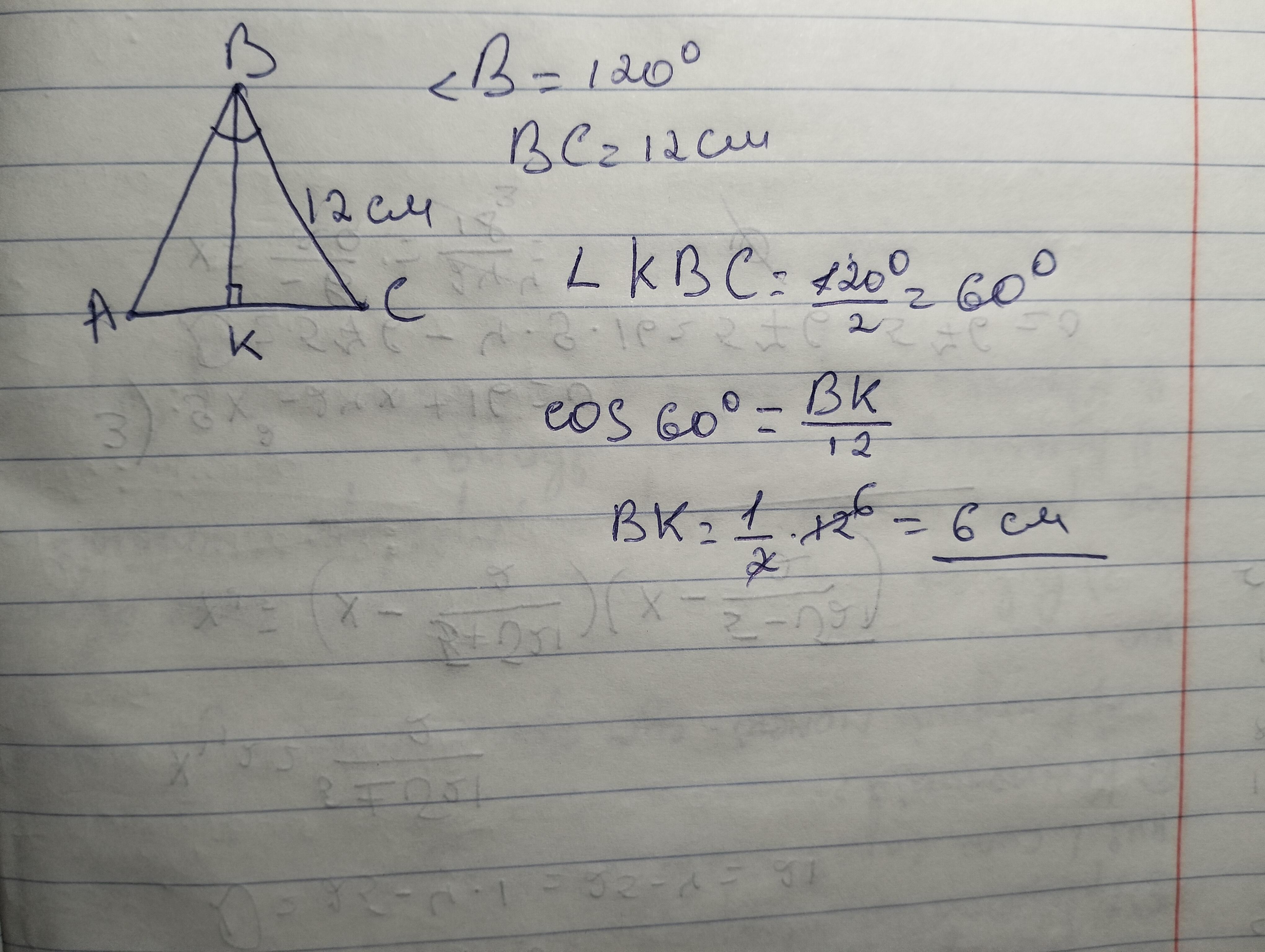 У рівнобедреному трикутнику АВС з основою АС проведено висоту ВК.ЗНАЙТИ ЇХ ДОВЖИНУ ЯКЩО КУТ В=120°,ВС=12см.