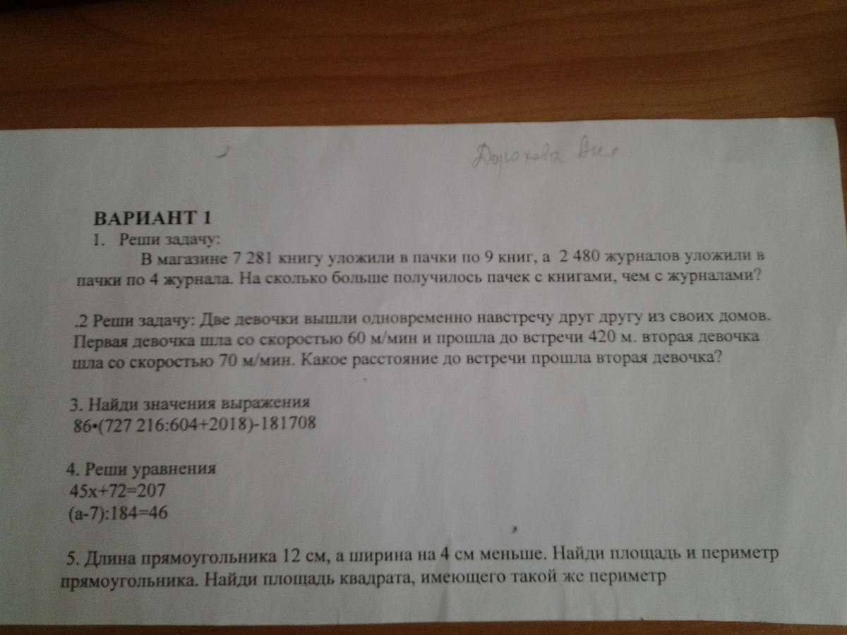 5 задание длина 12 см ширина 12-4=8 см Периметр прямоугольника =2*(а+b)=2*(12+8)=40 см Площадь прямоугольника = аb=12*8=96 см Площадь квадрата = а в квадрате= 10 в квадрате=100 см