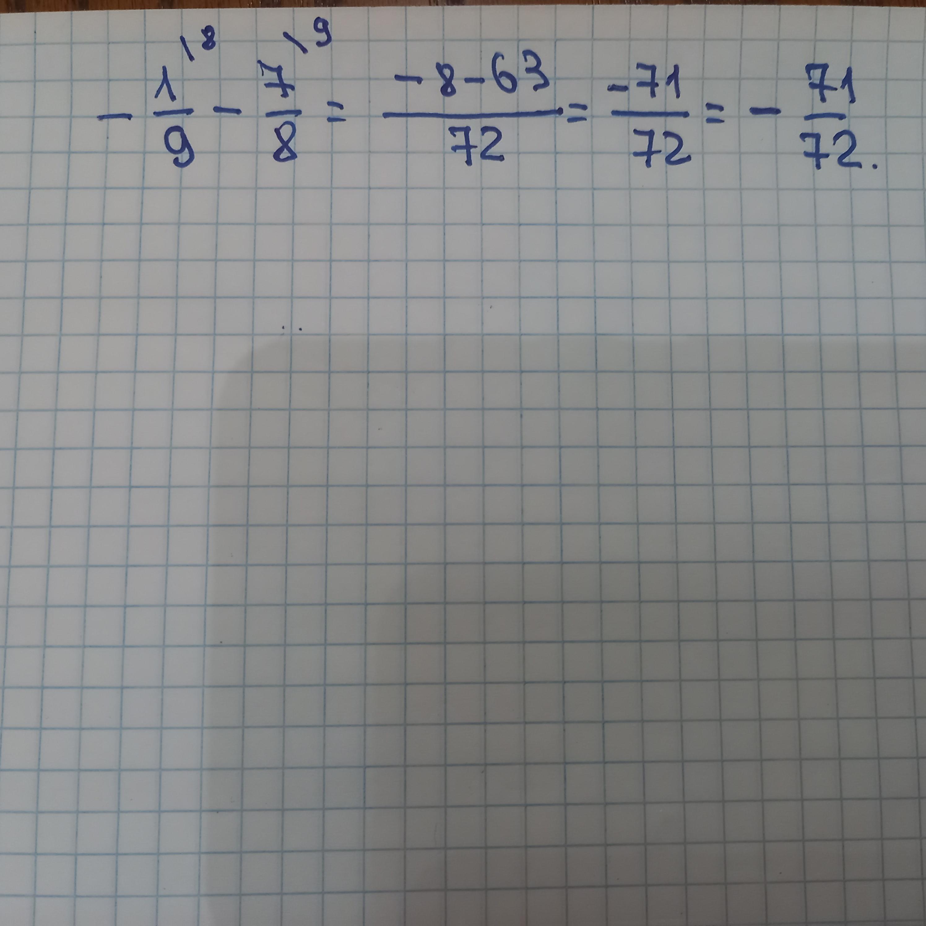 Извините, я ошибся в своем предыдущем ответе. Для сложения дробей с разными знаменателями необходимо привести их к общему знаменателю и затем сложить числители. Общим знаменателем для дробей -1/9 и -7/8 будет 72, так как это наименьшее общее кратное 9 и 8.