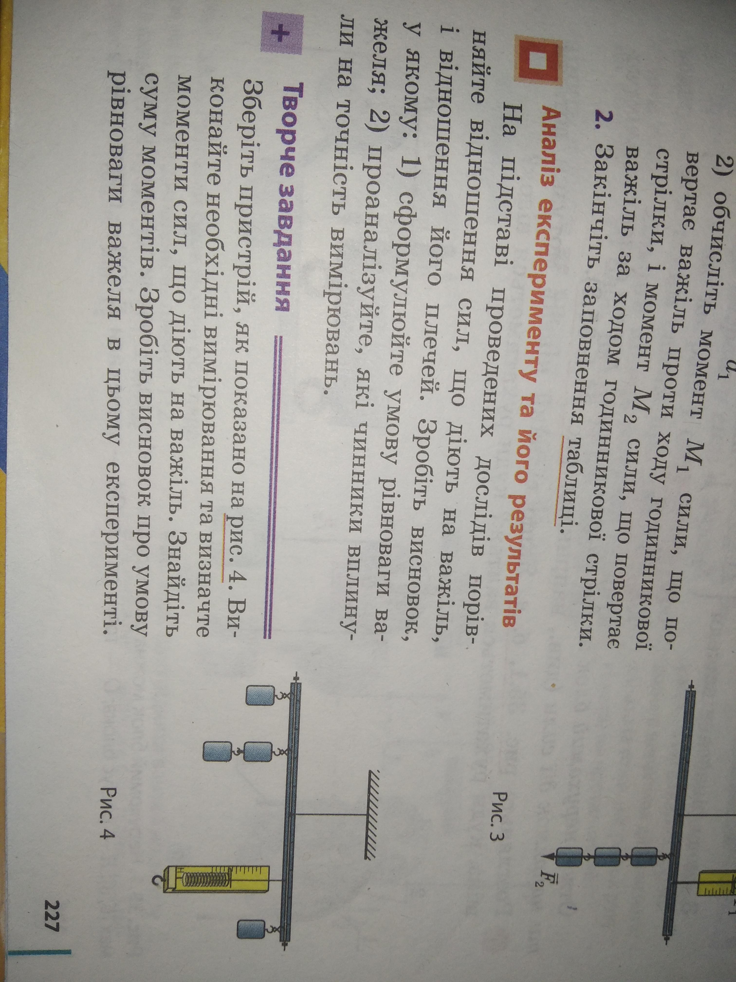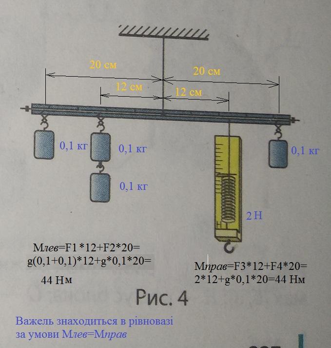 Зберіть пристрій, як показано на рис. 4. Виконайте необхідні вимірювання та визначте моменти сил, що діють на важіль. Знайдіть суму моментів. Зробіть висновок про умову рівноваги важеля в цьому експерименті