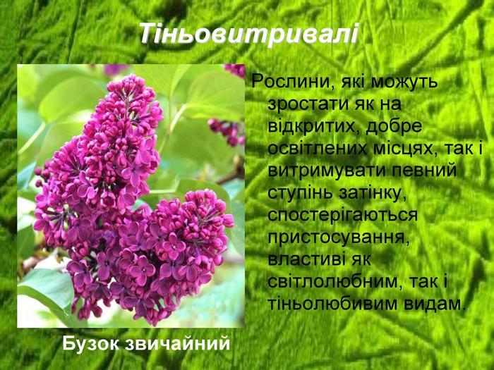 Бузок-світлолюбна,темнолюбна,вологолюбна,темновитривала-