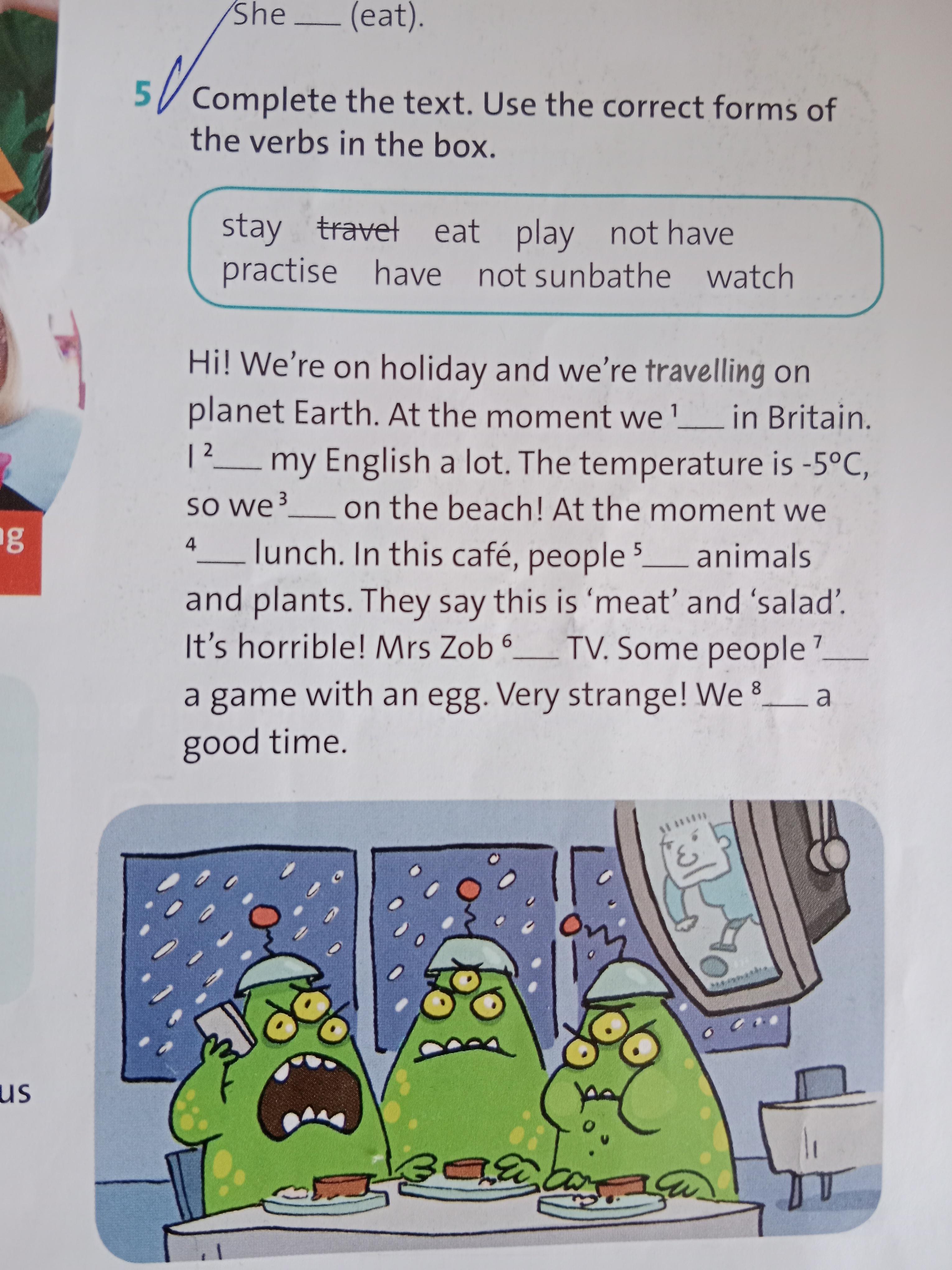 Hi! We're on holiday and we're travelling on planet Earth. At the moment we are staying in Britain. I am practising my English a lot. The temperature is -5°C, so we are not sunbathing on the beach! At the moment we are eating lunch. In this café, people are not having animals and plants. They say this is 'meat' and 'salad'. It's horrible! Mrs Zob is watching TV. Some people are playing a game with an egg. Very strange! We are having a good time.