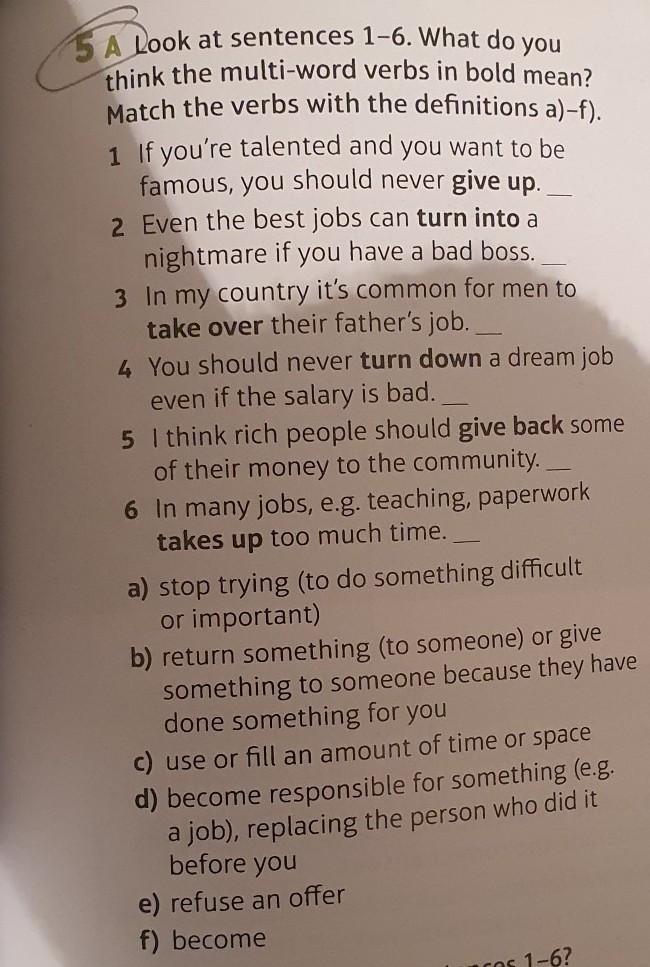 5 A Look at sentences 1-6. What do you think the multi-word verbs in bold mean? Match the verbs with the definitions a)-f). 2 1 If you're talented and you want to be famous, you should never give up. Even the best jobs can turn into a nightmare if you have a bad boss. In my country it's common for men to take over their father's job. 3 4 You should never turn down a dream job even if the salary is bad. 5 I think rich people should give back some of their money to the community. 6 In many jobs, e.g. teaching, paperwork takes up too much time. a) stop trying (to do something difficult or important) b) return something (to someone) or give something to someone because they have done something for you c) use or fill an amount of time or space d) become responsible for something (e.g. a job), replacing the person who did it before you e) refuse an offer f) become