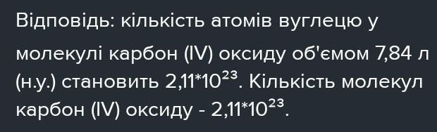 Відповідь: кількість атомів вуглецю у молекулі карбон (IV) оксиду об'ємом 7,84 л (н.у.) становить 2,11*10²³. Кількість молекул карбон (IV) оксиду - 2,11*10²³.