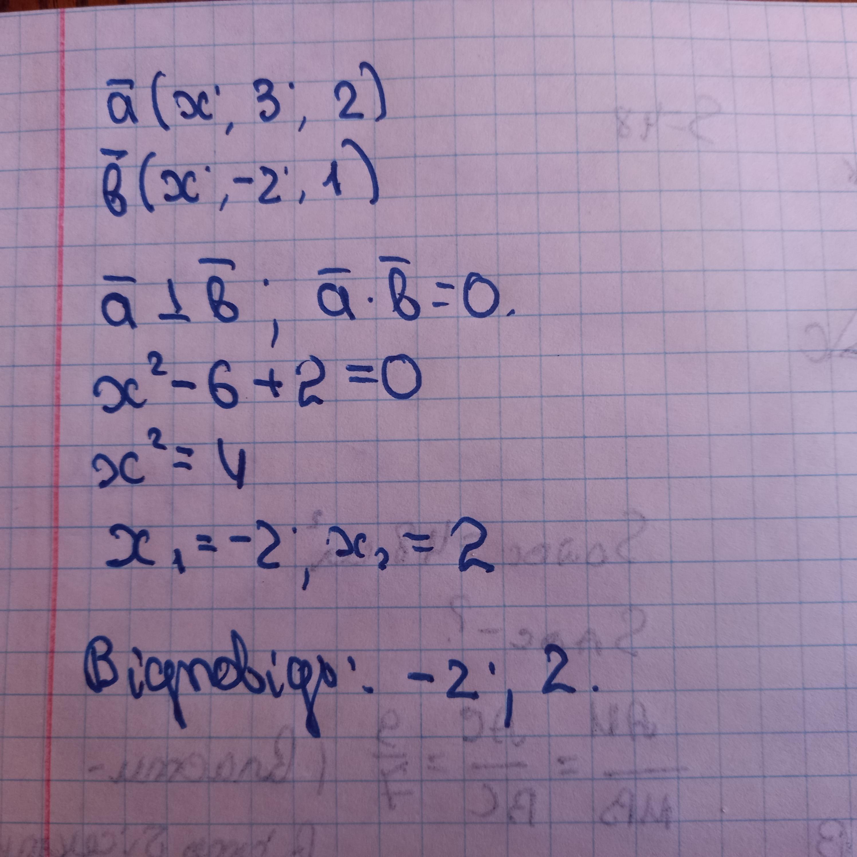 При яких значення х вектори а̅(х; 3; 2) і b̅(х; − 2; 1) перпендикулярні ?