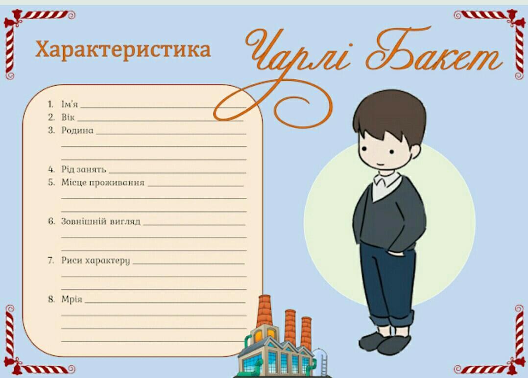 Характеристика Чарлі Бакет: бідний хлопчик, якому раз на рік — на його день народження — дарували єдиний дарунок — маленький шоколадний батончик; розумний, вихований, слухняний, добрий; улюбленець родини;