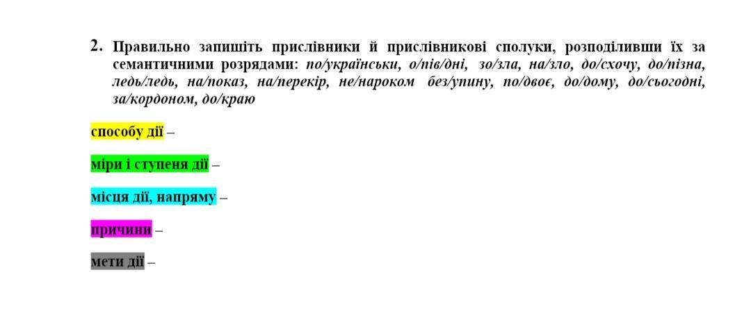 по-українськи, опівдні, зозла, назло, досхочу, допізна, ледь-ледь, напоказ, наперекір, ненароком, без упину, по двоє, додому, до сьогодні, за кордоном, до краю