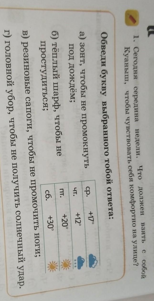 1. Сегодня середина недели. Что должен взять с собой Куаныш, чтобы чувствовать себя комфортно на улице, Обведи букву выбранного тобой ответа: среда +17°, четверг +12°, пятница +20°, суббота +30°. а) зонт, чтобы не промокнуть под дождём; б) тёплый шарф, чтобы не простудиться; в) резиновые сапоги, чтобы не промочить ноги; г) головной убор, чтобы не получить солнечный удар.