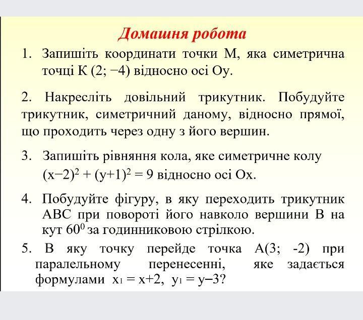 Щоб побудувати фігуру, в яку переходить трикутник ABC при повороті навколо вершини в на кут 60⁰ за годинниковою стрілкою, можна використати метод "повороту". Для цього вибираємо точку, навколо якої буде проводитися поворот (у даному випадку - вершина C), і проводимо промені, що утворюють з цією точкою кут 60⁰. Потім кожну зі сторін трикутника обертаємо на цей кут в напрямку годинникової стрілки. Таким чином, фігурою, в яку переходить триЩоб знайти нові координати точки А при паралельному перенесенні, необхідно до кожної з координат додати відповідне зсув. За умовою, зсув по осі Ох дорівнює 2, а зсув по осі Оу дорівнює -3. Отже, нові координати точки А будуть: