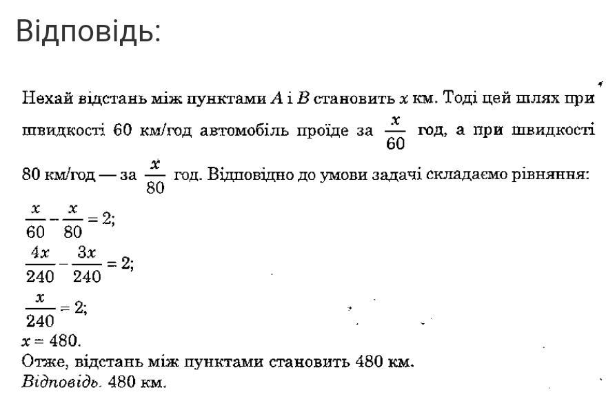 Автомобіль їхав з пункту А до пункту В. Якщо він буде їхати зі швідкістю 60км/год то запізниться на 1год, а якщо 80км/год то прибуде на годину раніше. Знайдіть відстань між пунктами А та В.