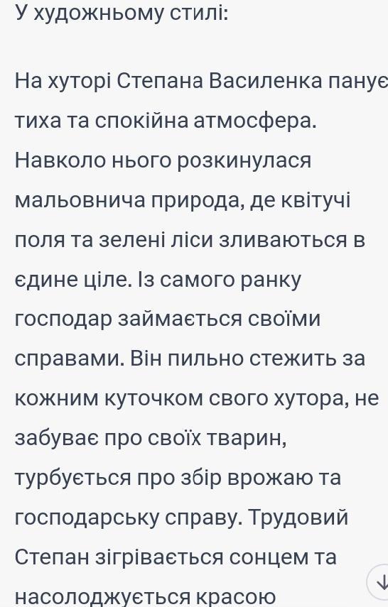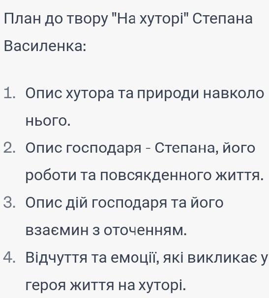 Допоможіть будь ласка!!до уривку творча "на хуторі" Степана василенка треба скласти план а потім стисло переказати з елементами опису і у художньому стилі.