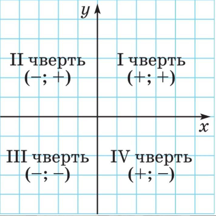 На малюнку зображена координатна площина і написано де яка чверть знаходиться. Також навіть зазначено як дивитися по координатам