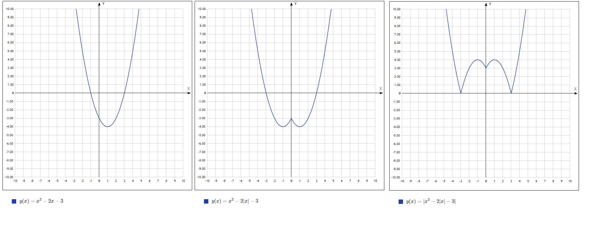 2) y(x)=x^2-2|x|-3=y(-x)-четная функция, поэтому построенную ранее параболу обрезаете по оси ОУ и зеркально отражаете относительно той же оси -второй рисунок