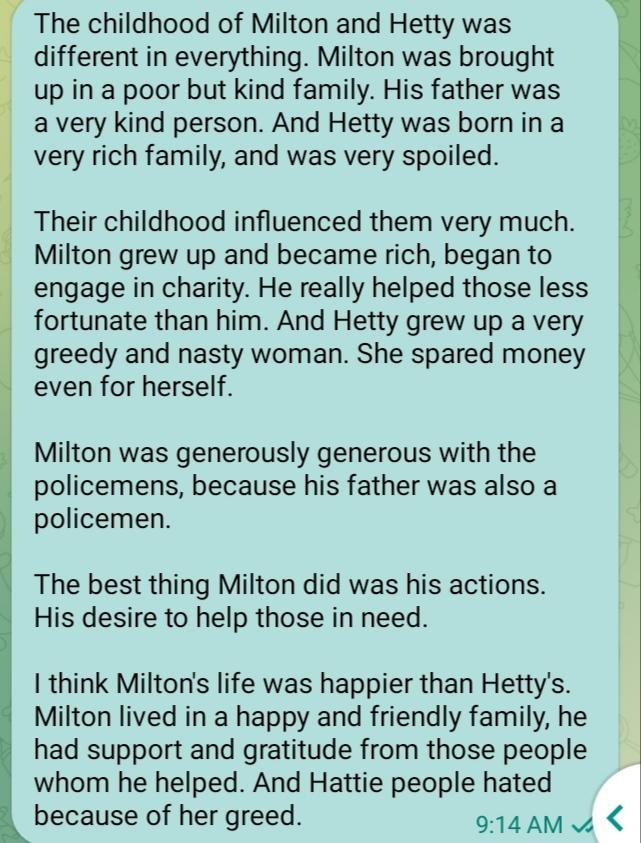 It is difficult to say who had a happier life, as happiness is subjective and can depend on many factors. However, it could be argued that Milton, despite his difficult upbringing, found happiness and fulfillment through his philanthropic work and the respect he earned in his community. Hetty, on the other hand, may have been wealthy and successful, but her reputation was tarnished by accusations of greed and dishonesty.