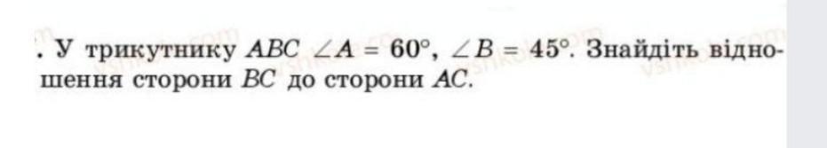 В треугольнике ABC угол <A=60°, <B=45°. Найдите отношение стороны ВС к стороне АС.