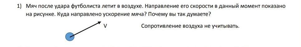 Мяч после удара футболиста летит в воздухе. Направление его скорости в данный момент показано на рисунке. Куда направлено ускорение мяча? Почему вы так думаете?
